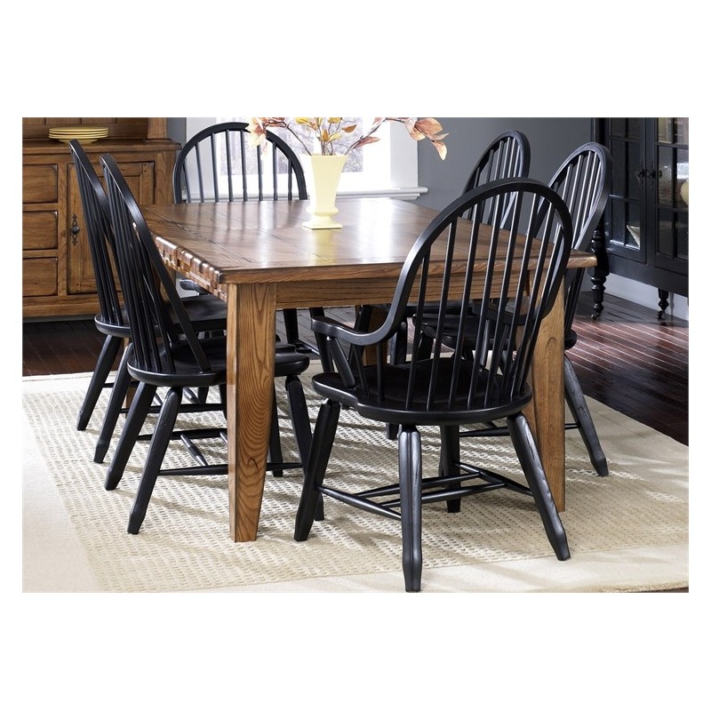 The Treasures dining collection by Liberty evokes the feel of a treasured antique. The collection is made of select hardwoods and ash veneers. The beauty of the wood is brought out with a rich oak finish. The collection features a solid top table and sheaf back chairs.