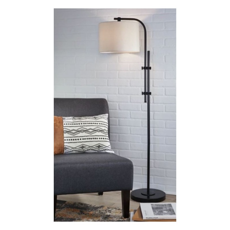 The Baronvale floor lamp features a beautiful black finish that adds a striking accent to your living space. The lamp is elegantly curved with soft edges, and is adjustable to provide targeted illumination. Topped off with a crisp white drum shade, this lamp provides a subtle and appealing classic design wherever placed.