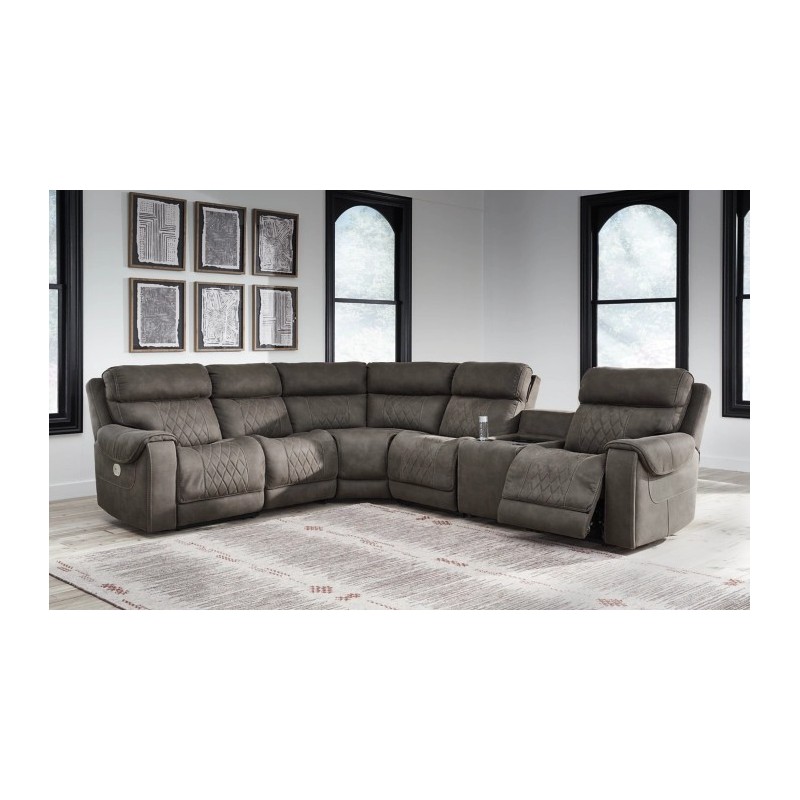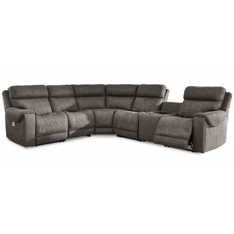 Stylish in design and function, the Hoopster power reclining sectional with console creates a comfortable place to gather with family and friends. This sectional, upholstered in heavyweight faux leather with quilting and jumbo stitching, invites you to sink into plush opulence at an affordable price. The zero-wall power reclining mechanism features infinite positions for comfort. Conveniently plug in your devices to the USB charging station. Appealing to those with an eye for sumptuous design and high-tech features, this gunmetal gray sectional will always be a win.