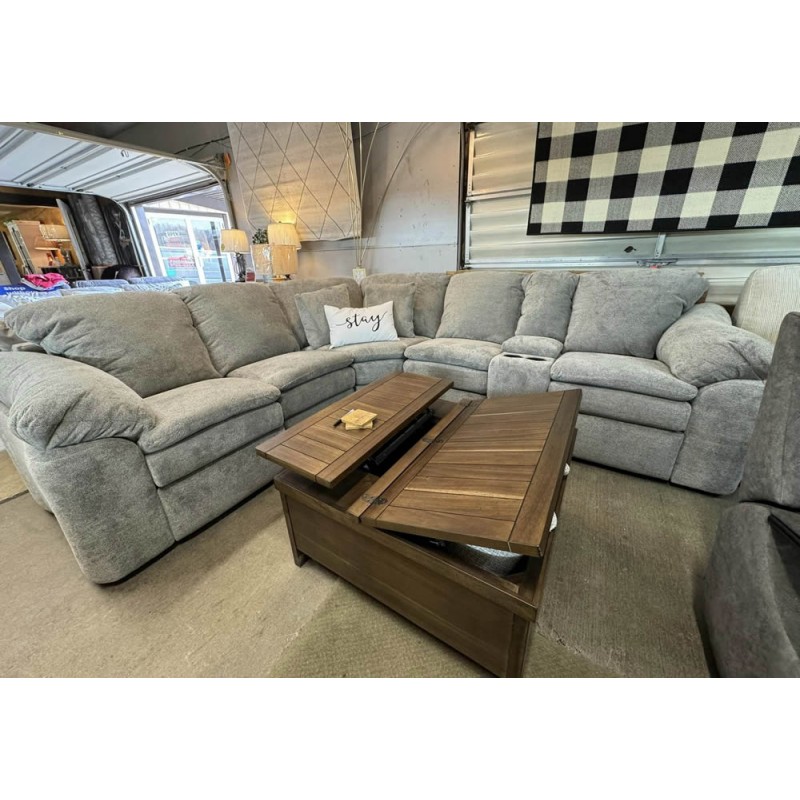 We have this sectional in-stock in the configuration and fabric in the photo.